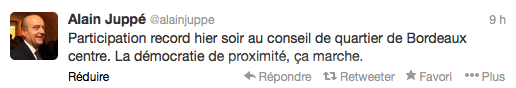 C’est pourquoi une assemblée initialement destinée à promouvoir la participation citoyenne (objectif fixé par la loi Démocratie et Proximité du 27 février 2002) est devenue à Bordeaux une tribune partisane où les militants UMP/MODEM sont convoqués pour venir applaudir le Maire candidat. Et ce dernier sur Twitter ne cache pas la satisfaction qui est la sienne pour toute cette mascarade :