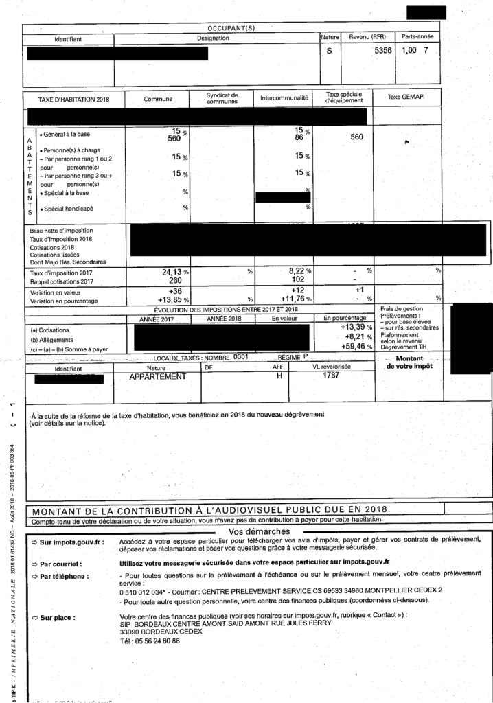 Nous faisions également remarquer à l’époque que cette diminution allait aussi avoir des conséquences pour les plus pauvres. D’ailleurs, une Bordelaise vivant avec un revenu fiscal de référence de 446 euros par mois vient de recevoir son avis. Compte tenu de son niveau de ressources, elle bénéficie d’allégements importants. Pourtant, malgré cela et en raison du mécanisme que nous expliquions, le montant de son impôt a augmenté de 59,46% !