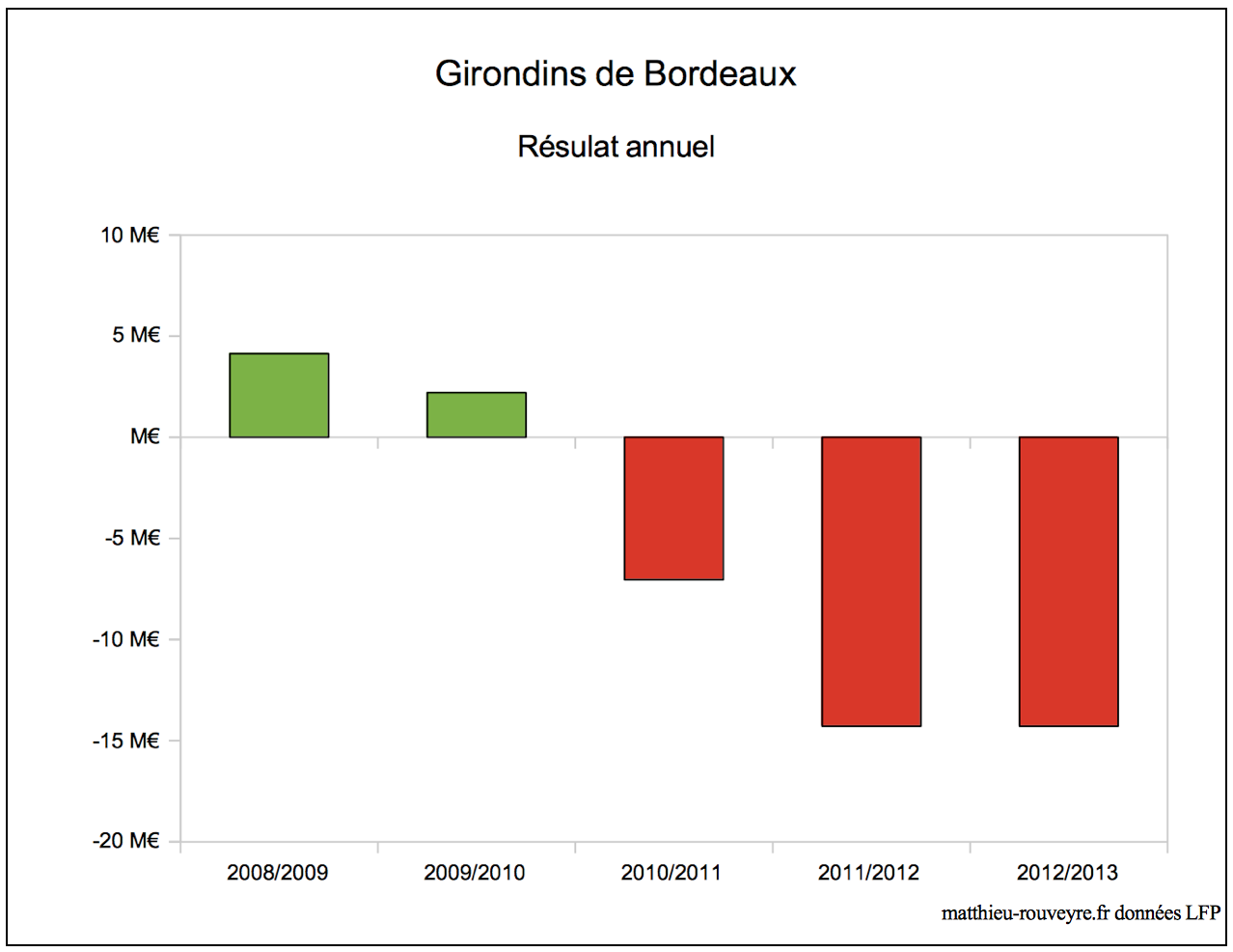 Rappelons que le Maire de Bordeaux avait refusé nos amendements qui réclamaient que la Ville ne soit pas garante des redevances du club des Girondins. Alain Juppé les a rejetés si bien que si le FCGB ne peut plus payer son loyer, c’est la Ville qui le prend en charge. Or, il se trouve que les Girondins vont difficilement pouvoir régler ce nouveau loyer. Aujourd’hui, le club débourse environ 120.000 euros par an pour occuper Chaban. Dans le nouveau stade, il lui faudra payer chaque année 3,85 millions d’euros. Lorsque M6 a accepté le projet de nouveau stade et le loyer qui va avec, les comptes du club faisaient apparaître un bénéfice confortable. Malheureusement, les trois dernières années ont été catastrophiques pour les Girondins avec un déficit cumulé de 35,6 millions d’euros ! Autrement dit, il est fort probable que le scénario Marseillais se joue à Bordeaux et qu’un chantage subtil du club amène le Maire de Bordeaux à baisser la redevance réclamée aux Girondins en expliquant que la Ville se doit d’aider son équipe de football.