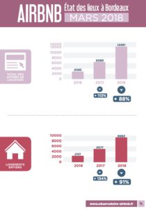 Au 28 février 2018, on compte 12.381 offres sur Airbnb à Bordeaux (+88% en 1 an), dont 9.682 logements entiers (+91% en 1 an). Si l’augmentation n’est pas aussi forte qu’entre 2016 et 2017 (+113% sur la totalité des logements, +134% sur les logements entiers), elle reste significative et particulièrement préoccupante.