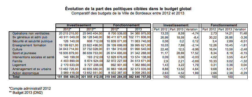 Voici un billet qui s’inspire de mon intervention de ce jour au conseil municipal du 18 novembre 2013. Avec cette dernière modification du budget pour l’année 2013, les chiffres nous apprennent que la part des politiques « culture », « sociale » et « enseignement » dans le budget global a baissé. Si bien par exemple que le budget consacré au social à Bordeaux n’est plus que de 2,01% (entre deux et trois fois moins que ce que consacrent les autres villes à leur budget social).